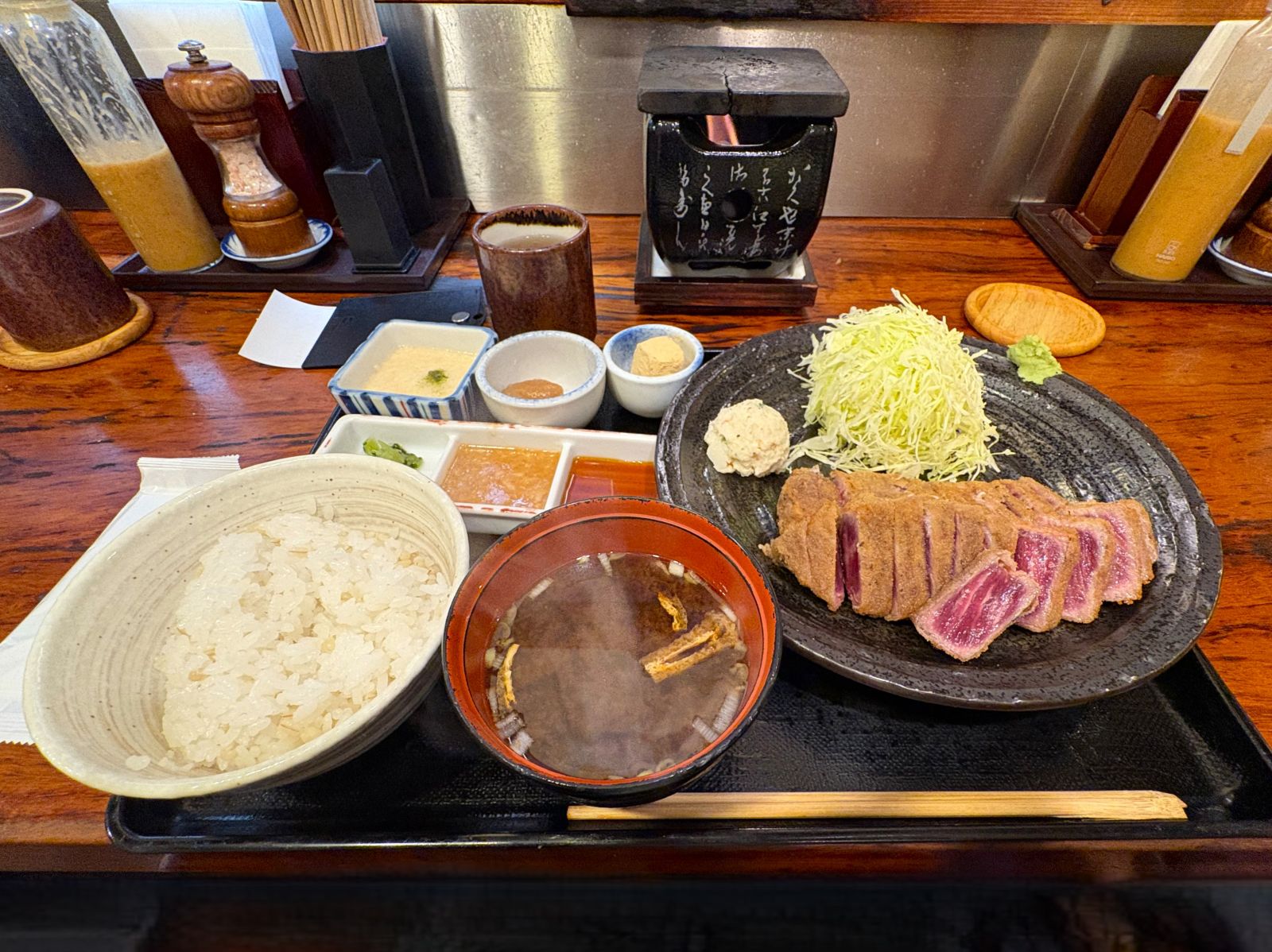 The supporting cast matters: mugi-meshi (barley rice) is chewy and comforting, the miso soup resets your palate, and the small sides and pickles keep things lively. Before you know it, you’re whispering, “Just one more slice… okay, maybe another bowl of rice.”